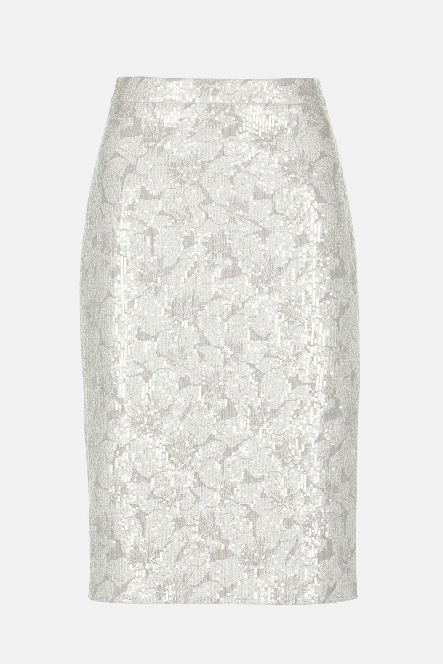 Midi skirt adorned with embroidered sequins forming a delicate floral pattern. Invisible back zip closure. Below-the-knee length. Regular fit.