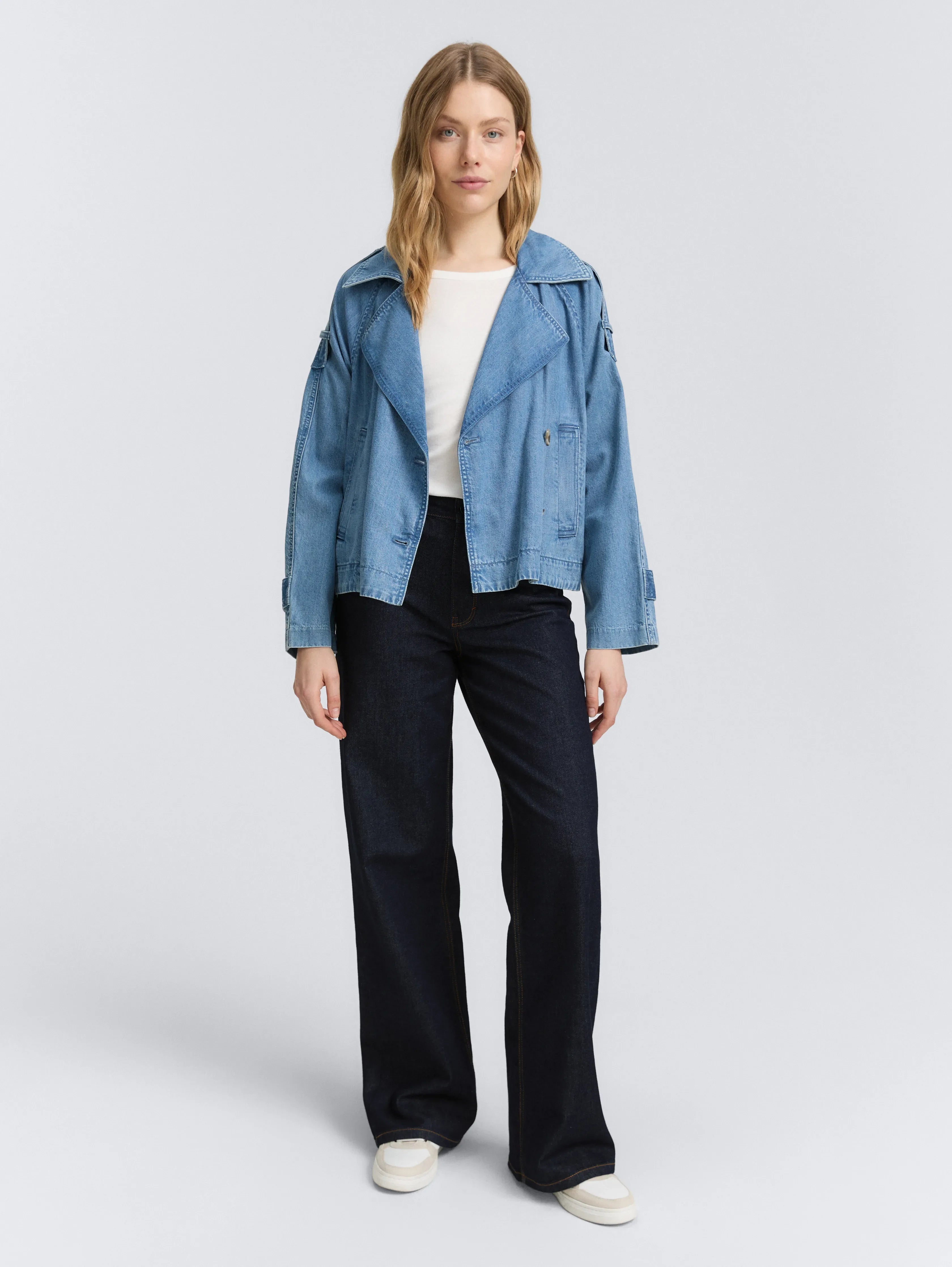 High-waisted jeans in a five-pocket style with side pockets at the front and patch pockets at the back. Stretch content ensures greater freedom of movement and a comfortable fit.